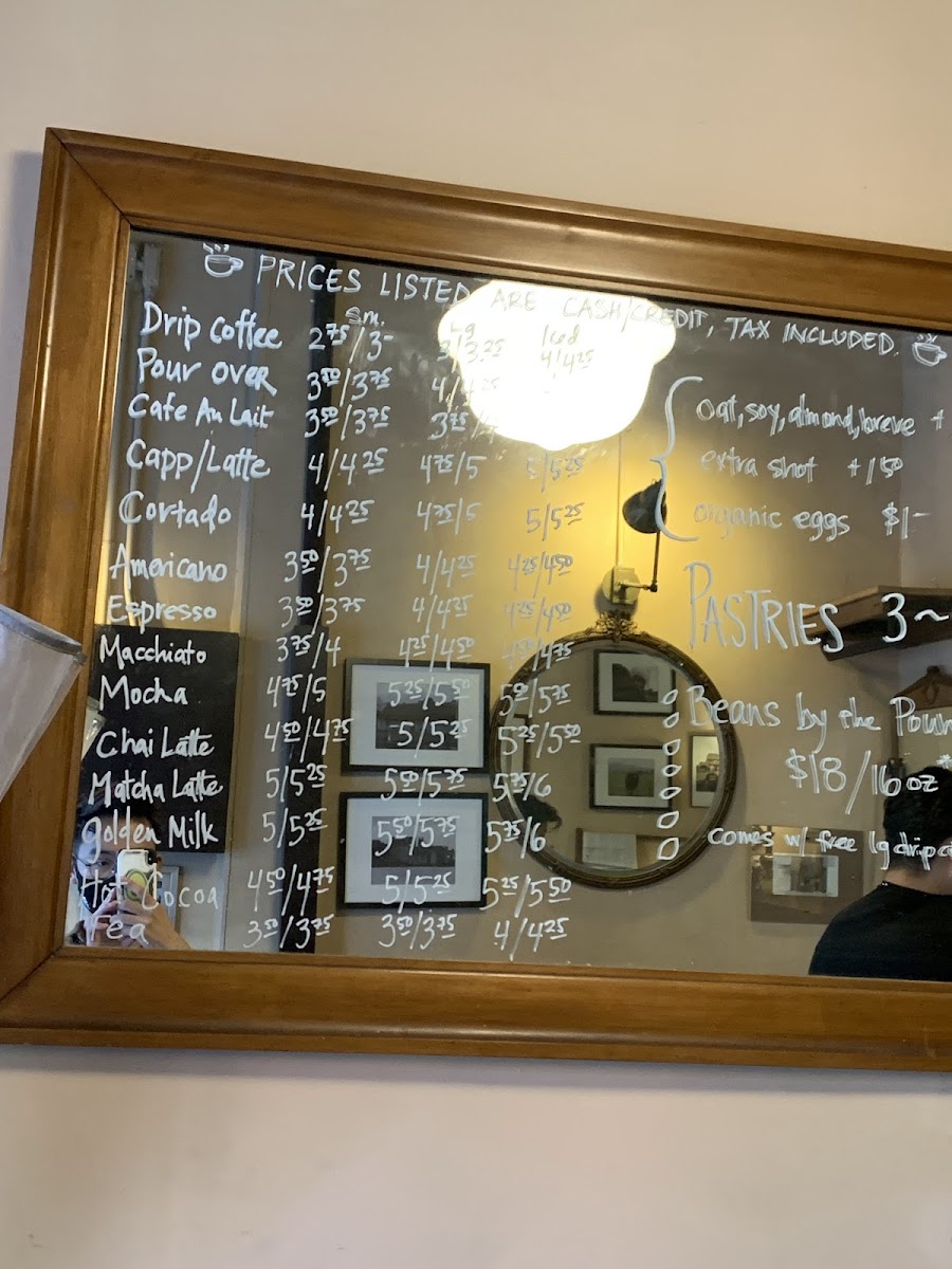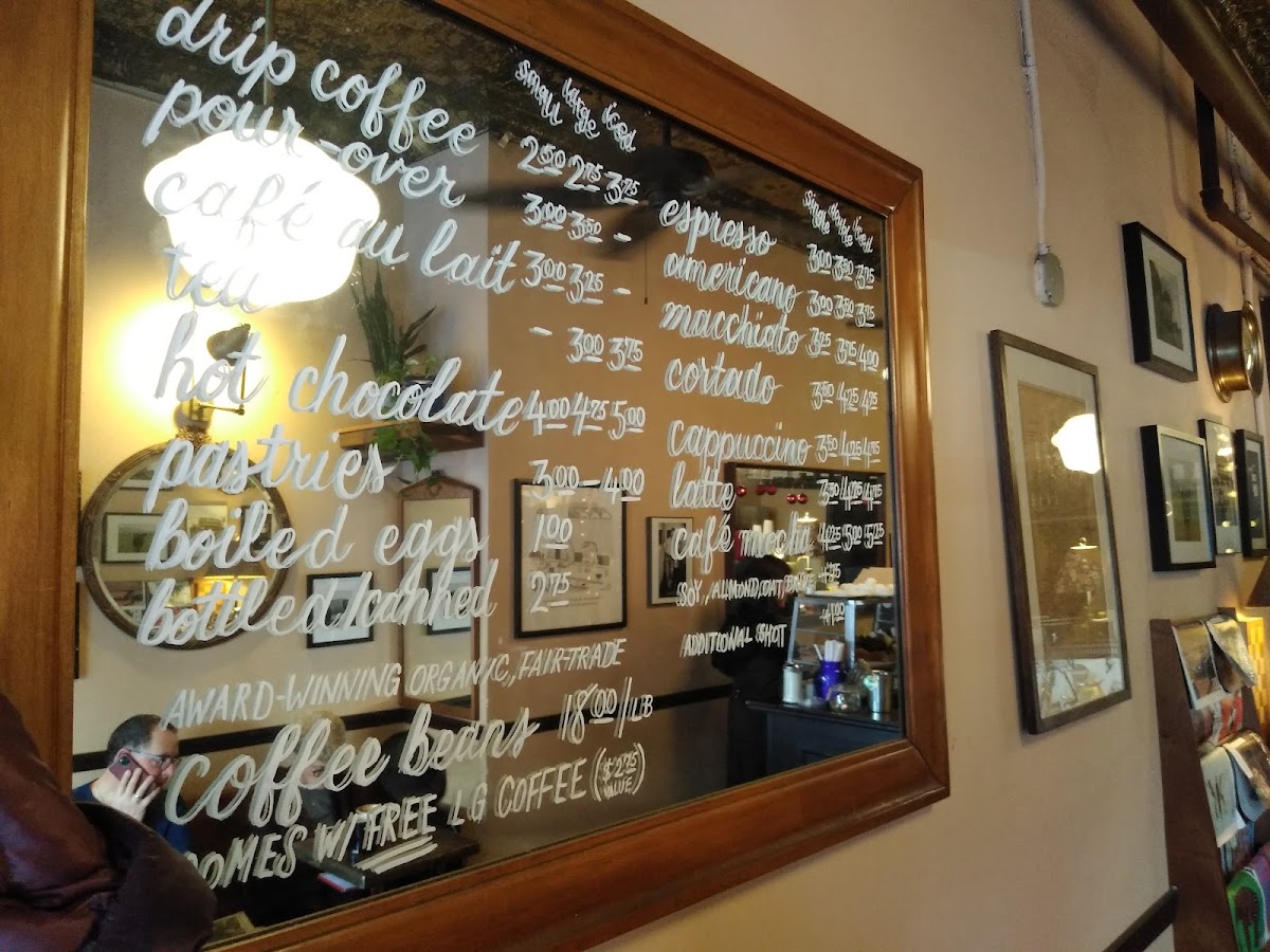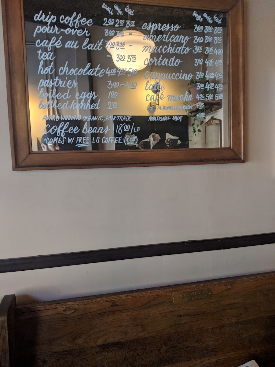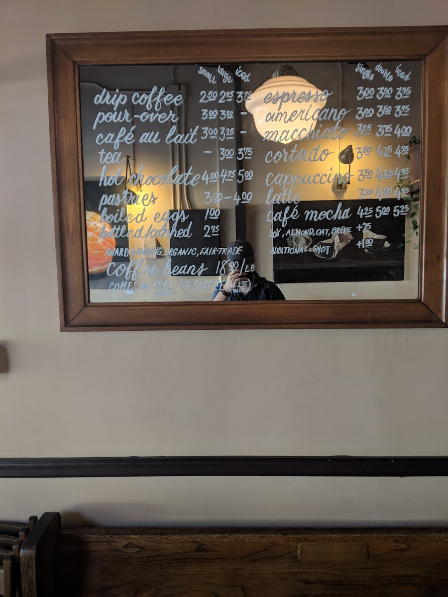 The menu features a variety of carefully prepared coffee and espresso beverages, including drip coffee, pour-over, espresso, Americano, macchiato, cortado, cappuccino, latte, and café mocha. Both hot and iced options such as iced latte and soy iced latte are available, catering to different preferences.